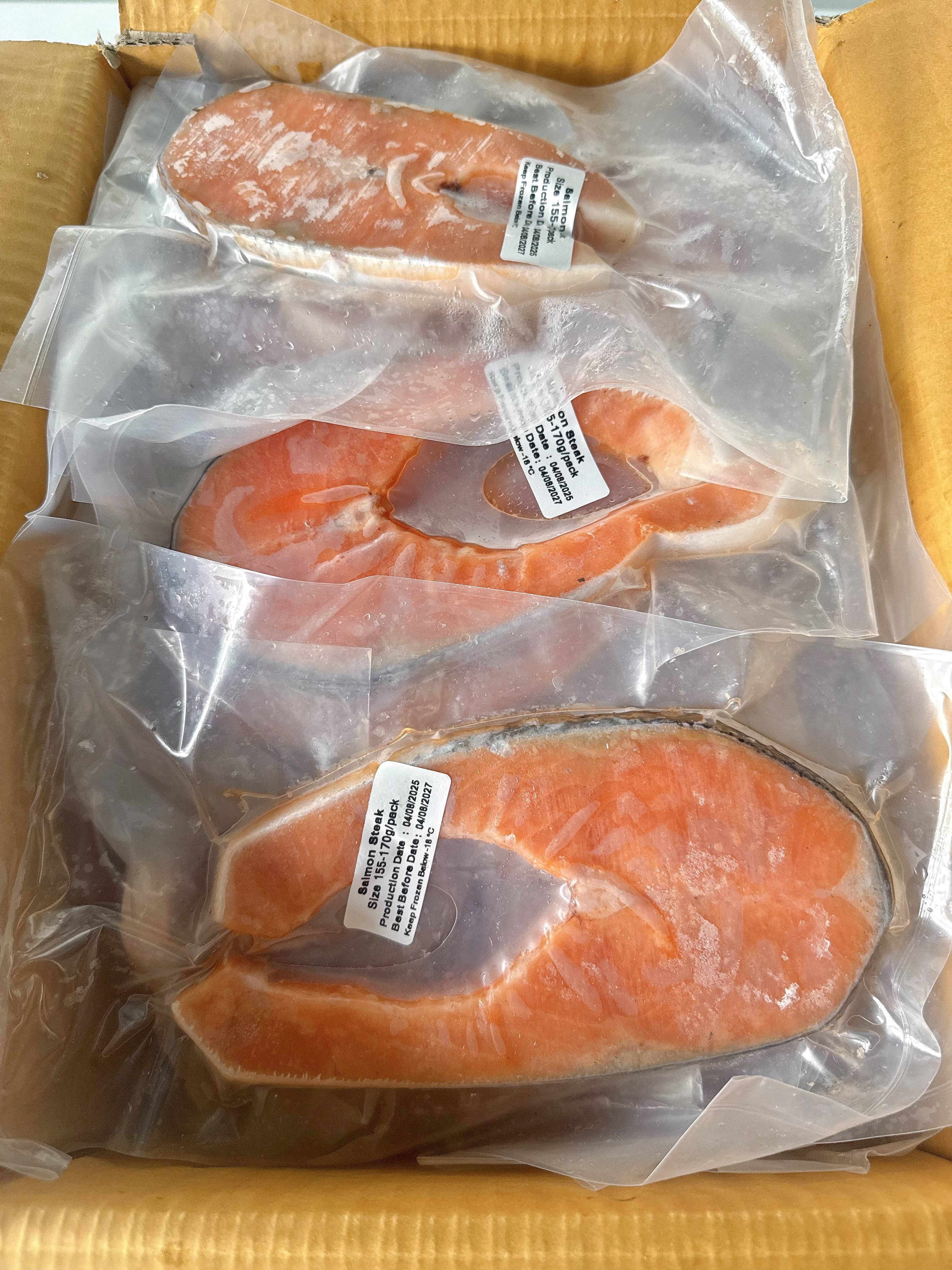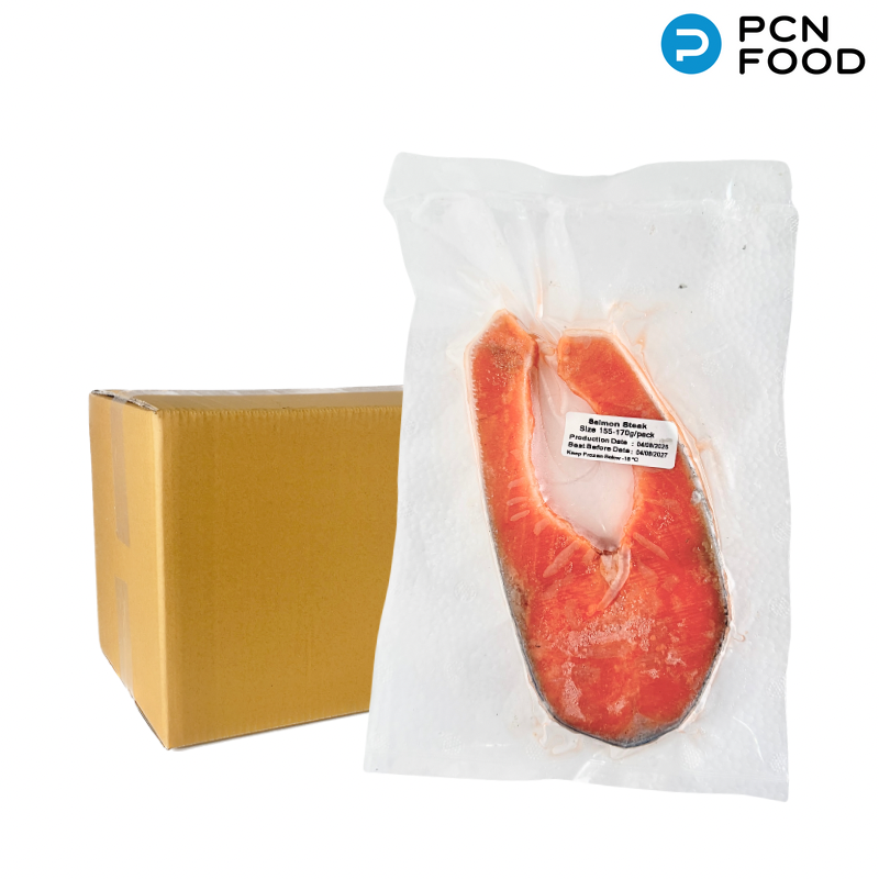 แซลมอนหั่นแบบสเต็ก เกรด A นํ้าหนัก 150-170 กรัม ต่อชิ้น แพ็คละ 1 ชิ้น